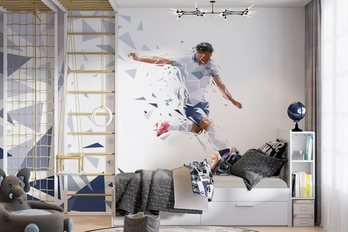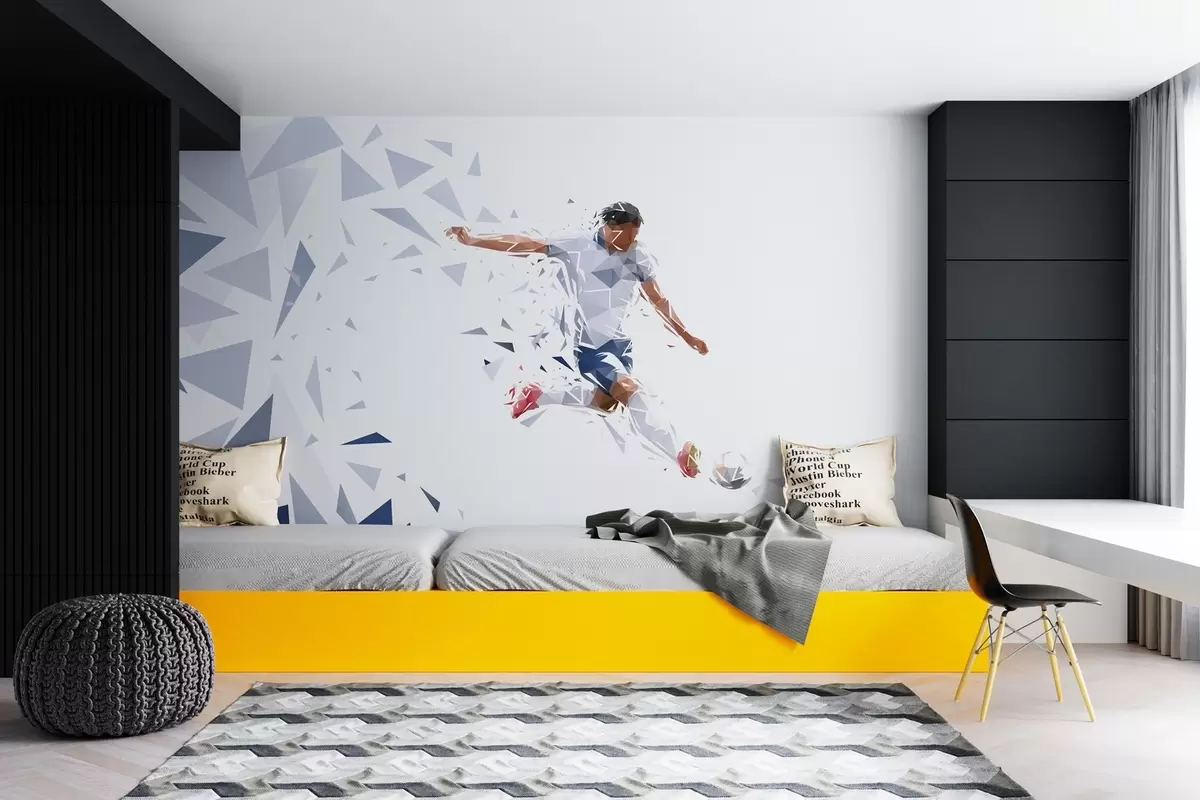 Valokuvatapetti Dynaaminen jalkapalloilija low-poly-tyylillä, joka lyö palloa.. Nr w03289