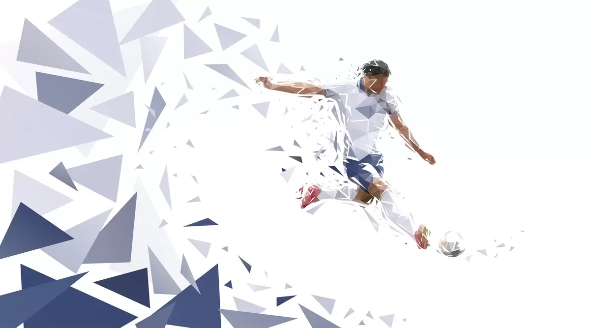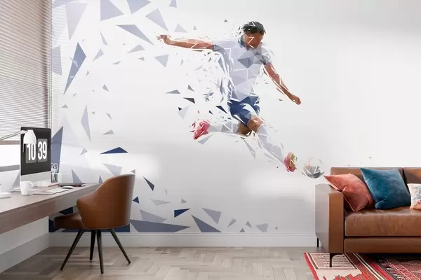 Valokuvatapetti Dynaaminen jalkapalloilija low-poly-tyylillä, joka lyö palloa.. Nr w03289