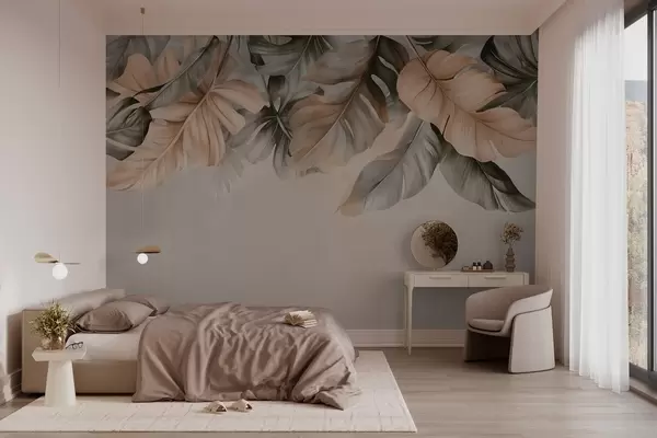 Valokuvatapetti Trooppiset lehdet roikkuvat yläreunasta, kuvioidulla taustalla Nr w03290