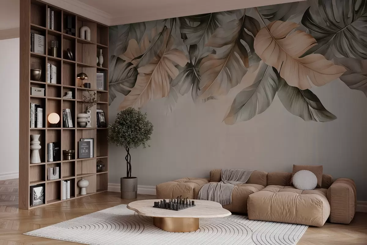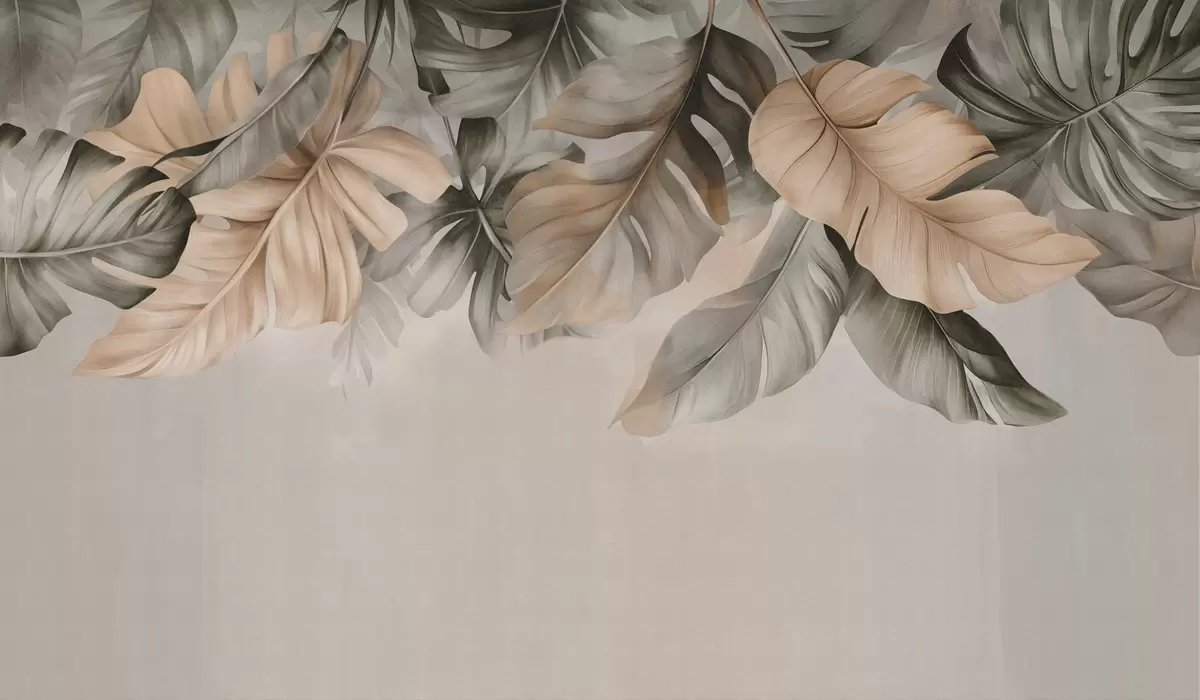 Valokuvatapetti Trooppiset lehdet roikkuvat yläreunasta, kuvioidulla taustalla Nr w03290