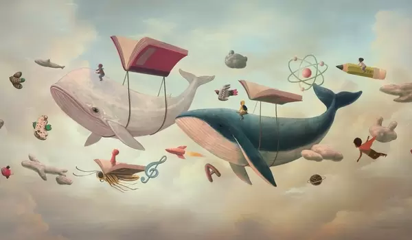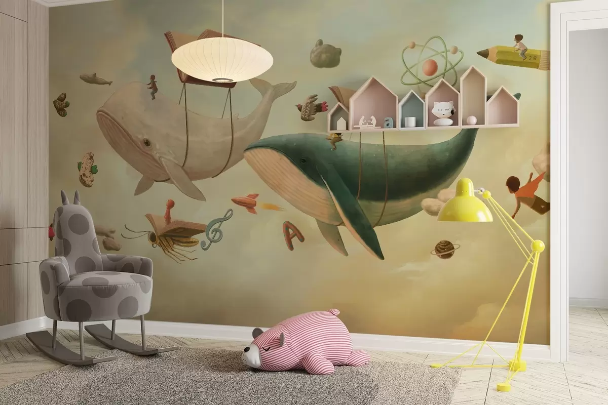 Valokuvatapetti Kummallinen kuvitus valaista, jotka lentävät taivaalla kirjanmuotoisten ilmapallojen alla Nr w03327v1