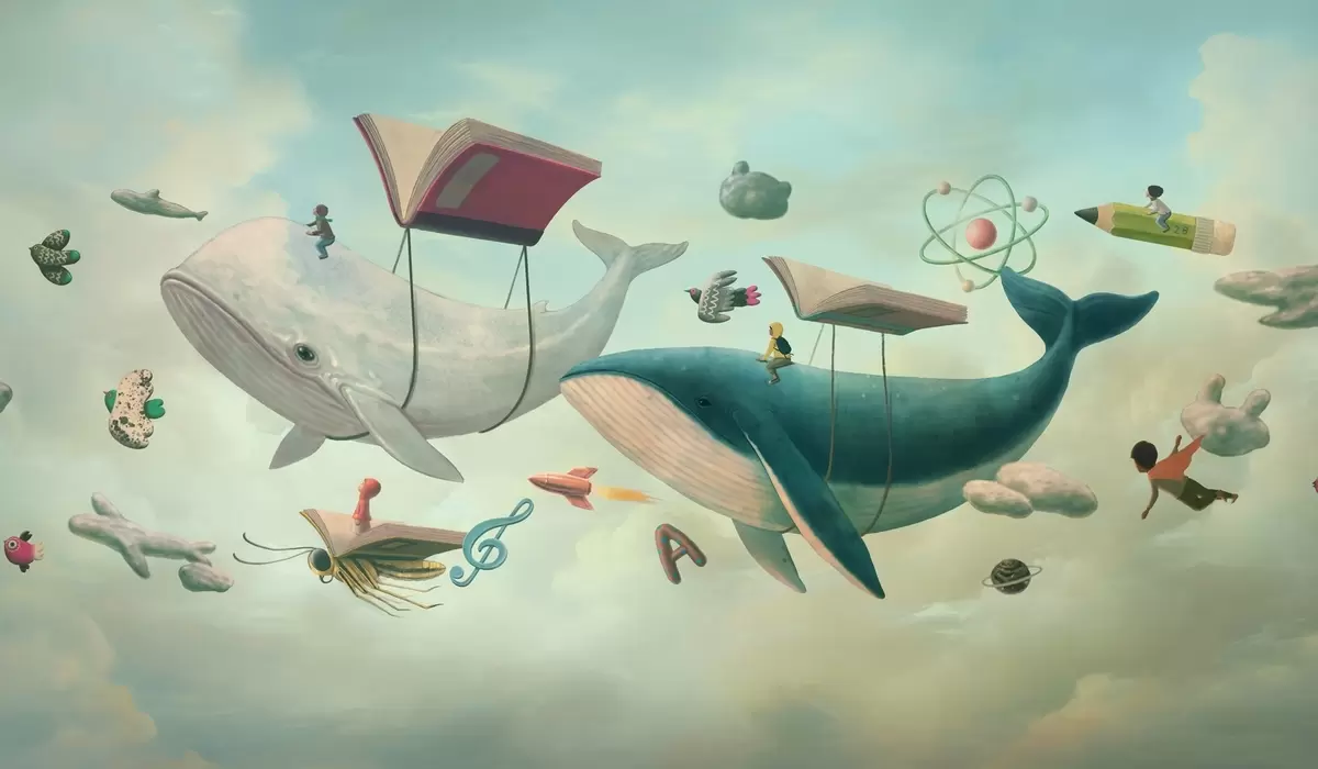 Valokuvatapetti Kummallinen kuvitus valaista, jotka lentävät taivaalla kirjanmuotoisten ilmapallojen alla Nr w03327v2