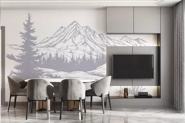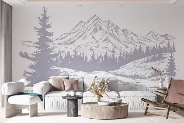 Valokuvatapetti Vuoristo maisema mäntyjä, metsä, luonto, pehmeä violetti väri Nr w03344v2