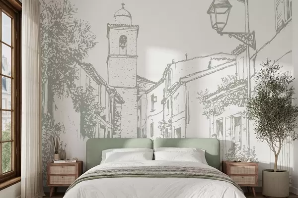 Valokuvatapetti Kaupungin katu, kaunis arkkitehtuuri, rakennukset, Välimeri, viivapiirros, oliiviväri Nr w03345