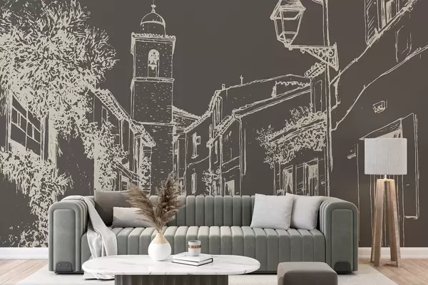 Valokuvatapetti Kaupunki katu, kaunis arkkitehtuuri, rakennukset, Välimeri, viiva piirustus, tumma väri Nr w03345v2