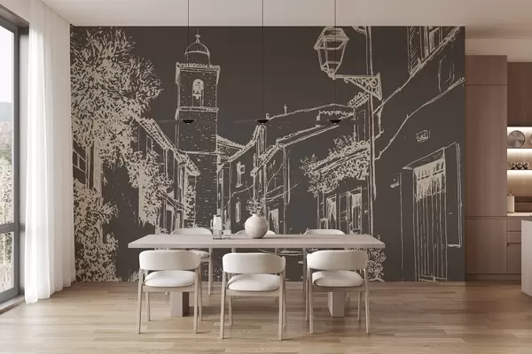 Valokuvatapetti Kaupunki katu, kaunis arkkitehtuuri, rakennukset, Välimeri, viiva piirustus, tumma väri Nr w03345v2