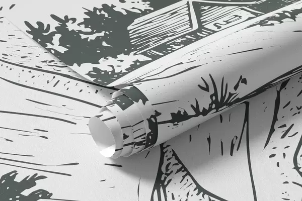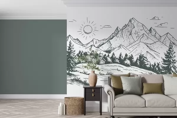Valokuvatapetti Vuoret piirustus, luontomaisemat, metsä, puutalot, vihreä väri Nr w03347