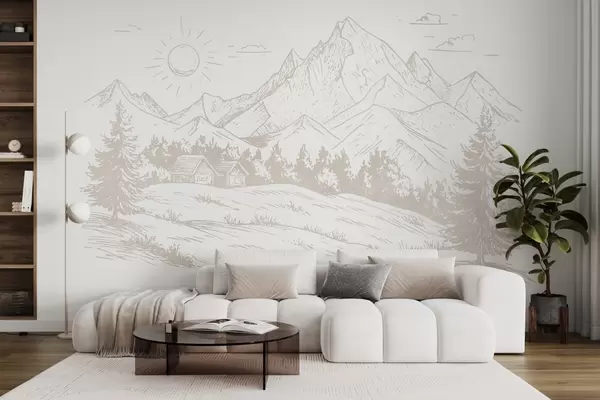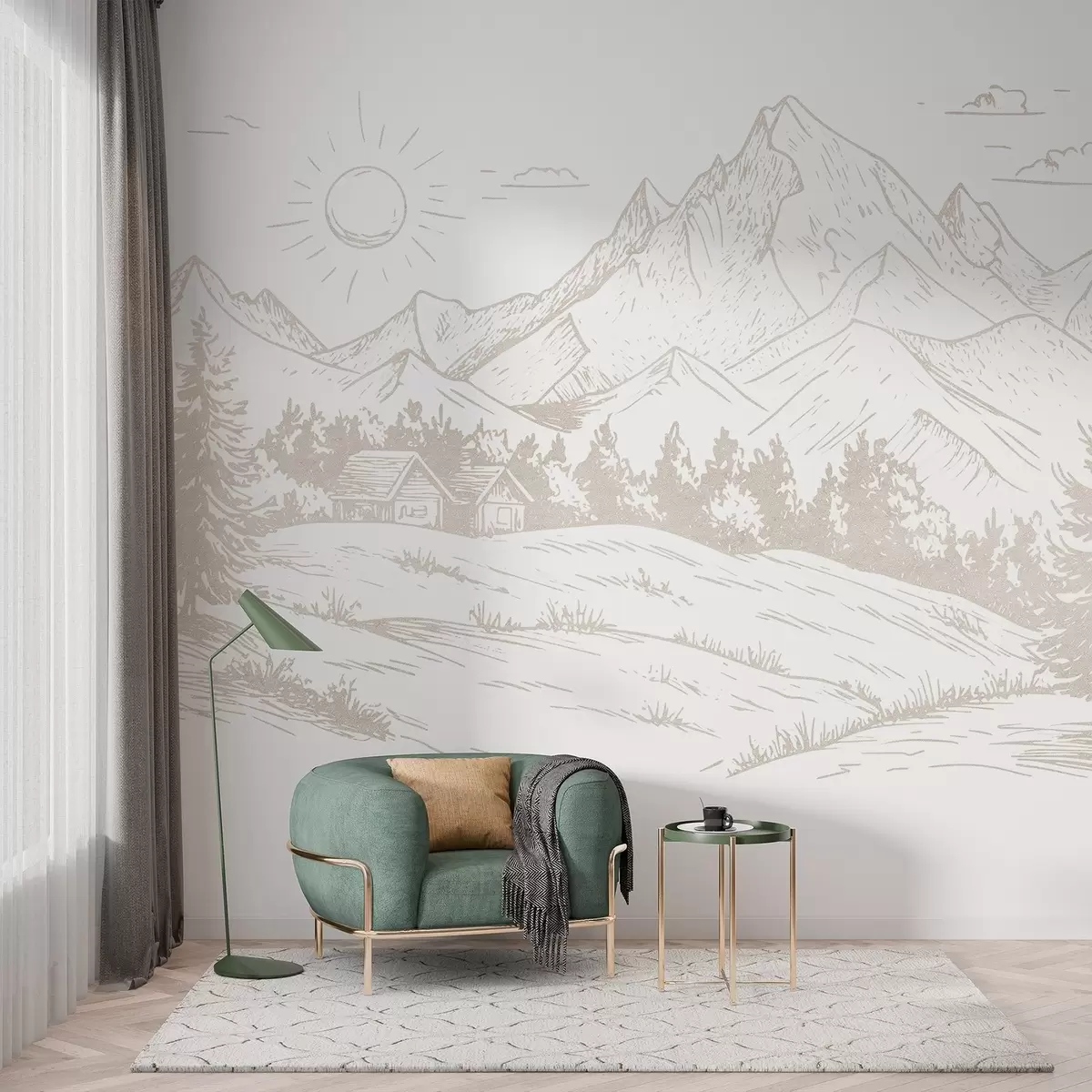 Valokuvatapetti Vuoret piirustus, luontomaisemat, metsä, puutalot, beige väri Nr w03348