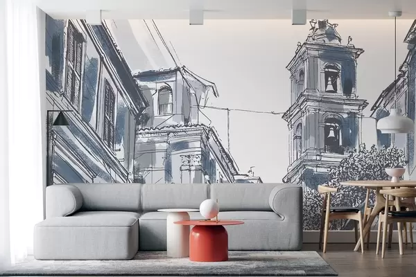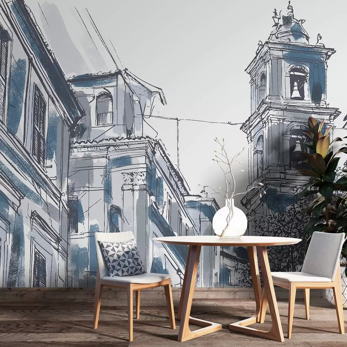Valokuvatapetti Välimeren kaupungin katu, kappeli, arkkitehtuuri, harmaa ja sininen väri Nr w03350