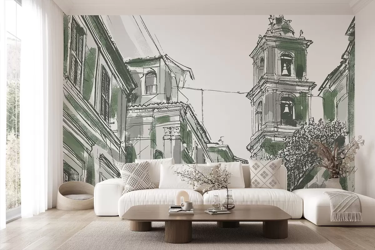 Valokuvatapetti Välimeren kaupungin katu, kappeli, arkkitehtuuri, harmaa ja vihreä väri Nr w03350v2