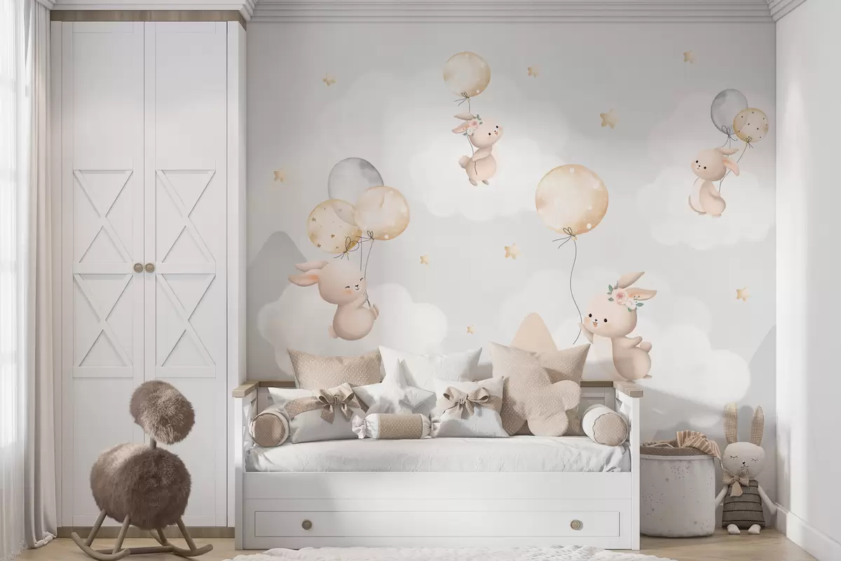 Valokuvatapetti Pupuja ilmapallojen kanssa pilvissä vuorten huippujen keskellä Nr w03375v1