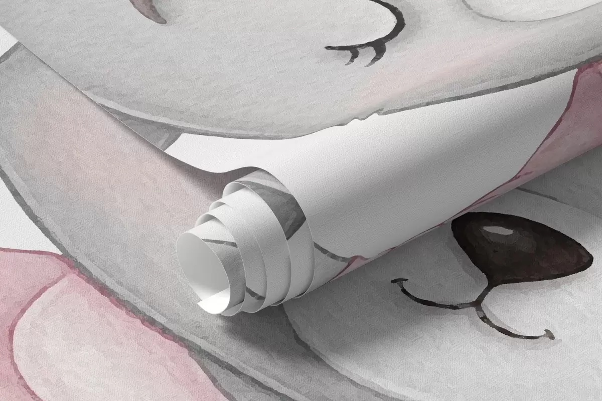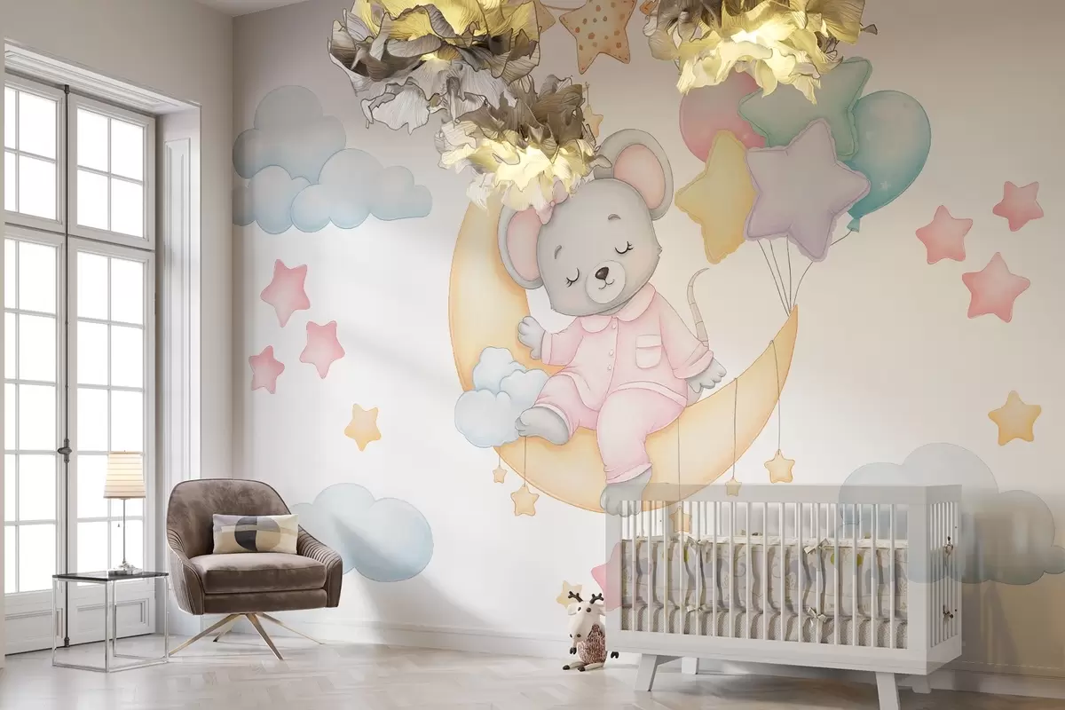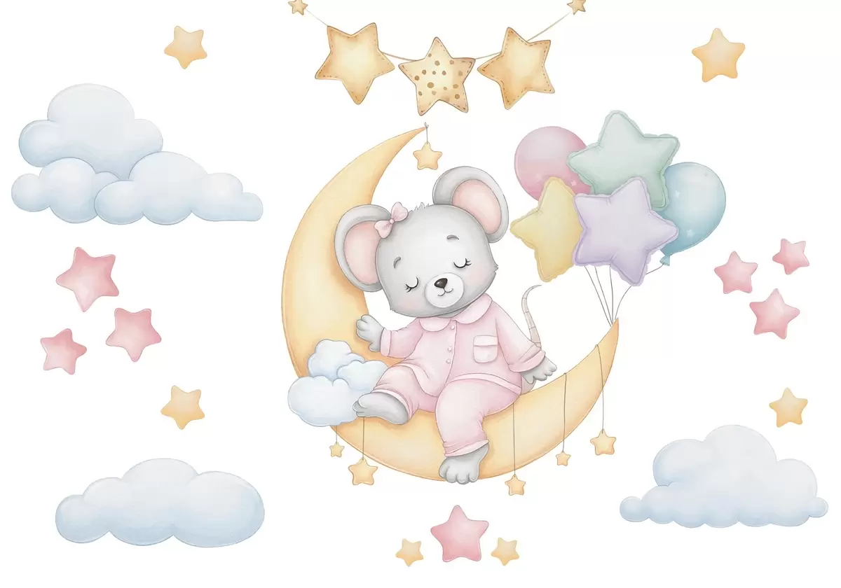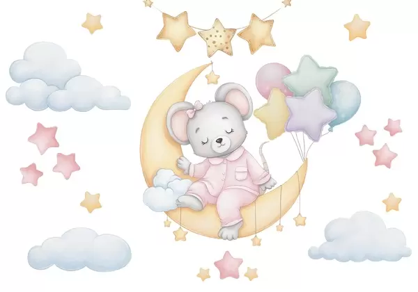 Valokuvatapetti Suloinen kuvitus nukkuvasta pienestä hiirestä kuussa tähtien, pilvien ja ilmapallojen ympäröimänä Nr w03380