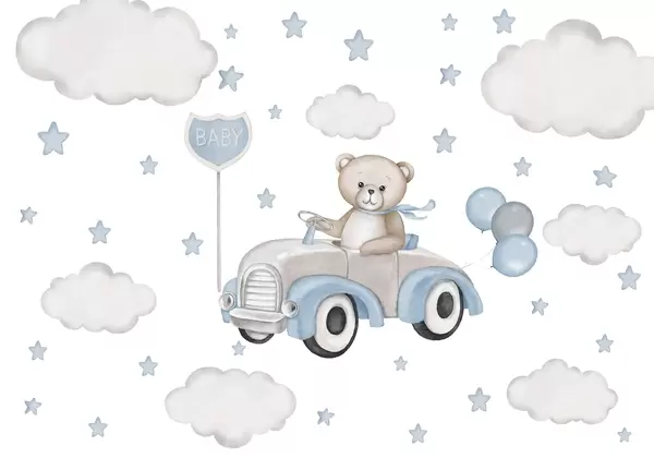 Valokuvatapetti Suloinen kuvitus nallekarhusta, joka ajaa vintage-autoa pilvien ja tähtien keskellä Nr w03382