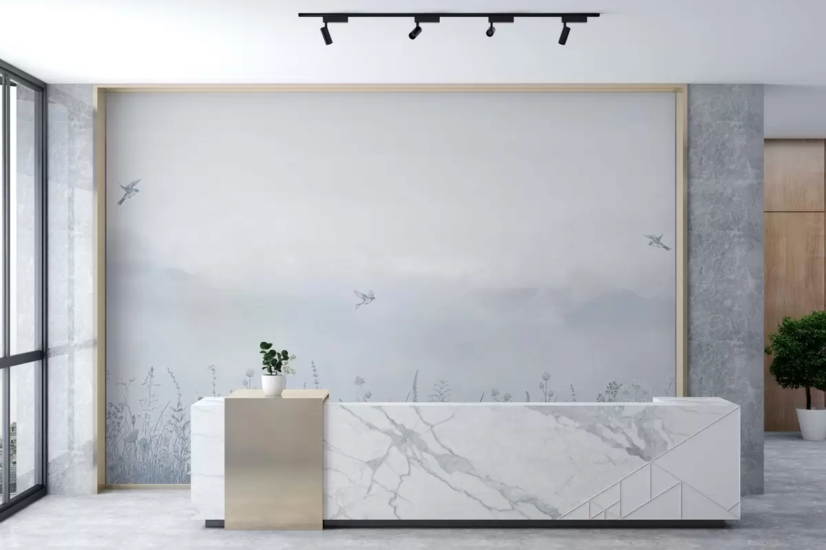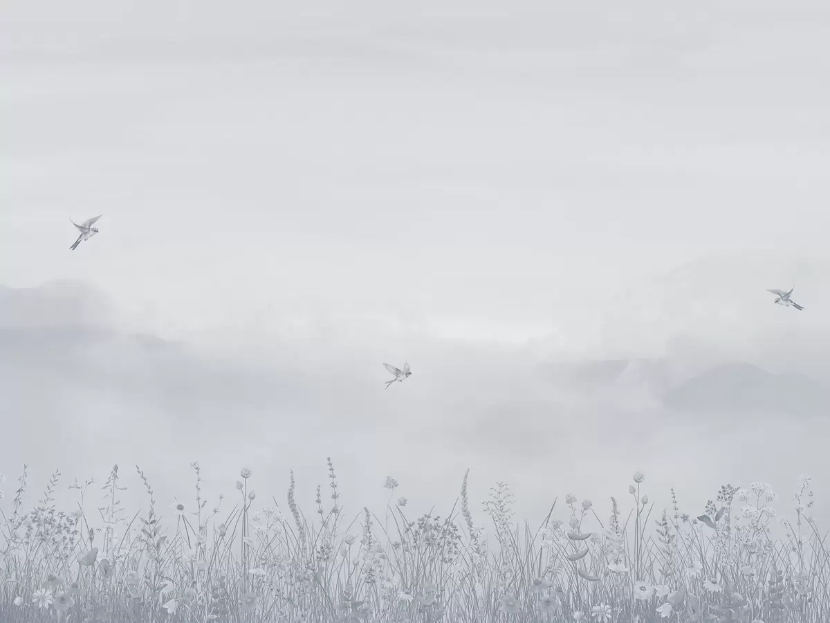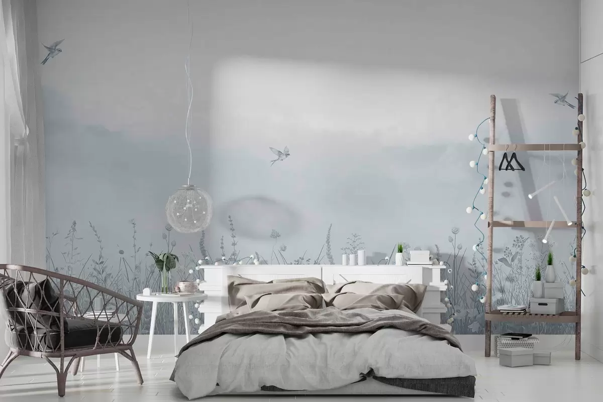 Valokuvatapetti Luonnonkukkia ja sumuinen taivas sinisin sävyin Nr w03391v1