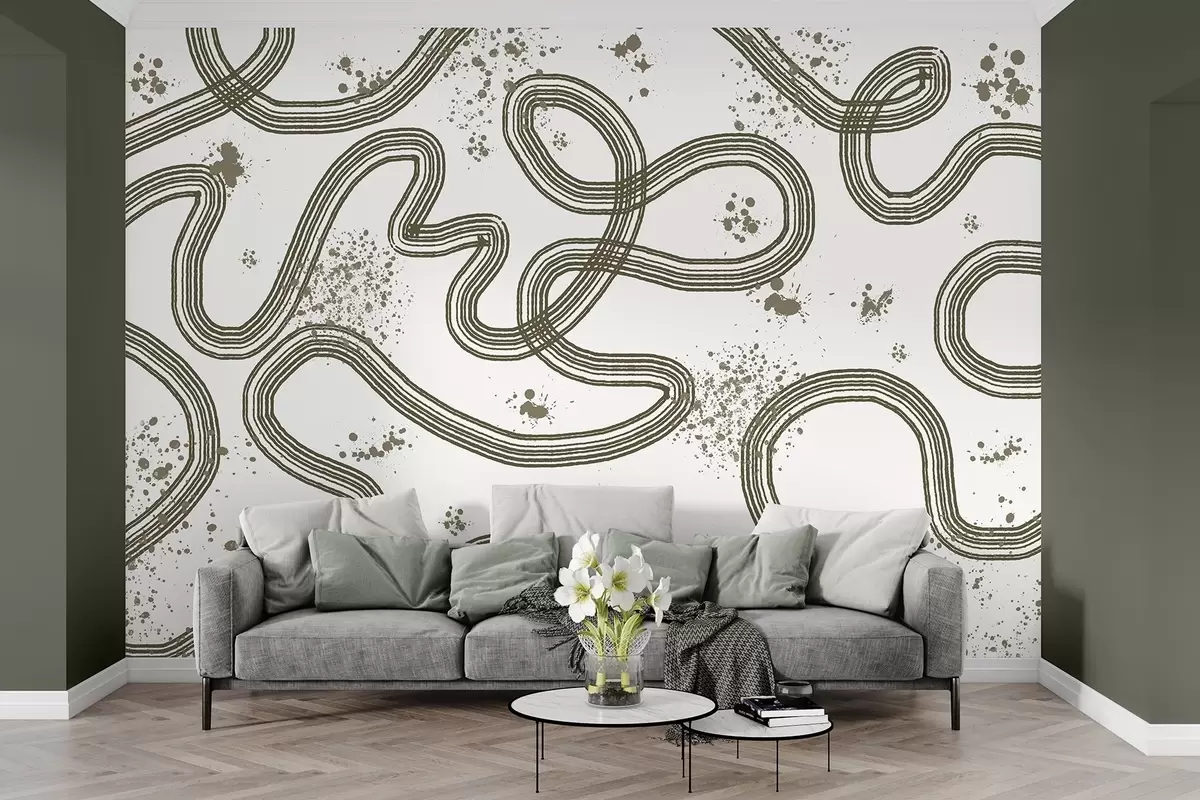 Valokuvatapetti Viivapiirros, maaliroiskeet, minimalismi, oliiviväri Nr w03408