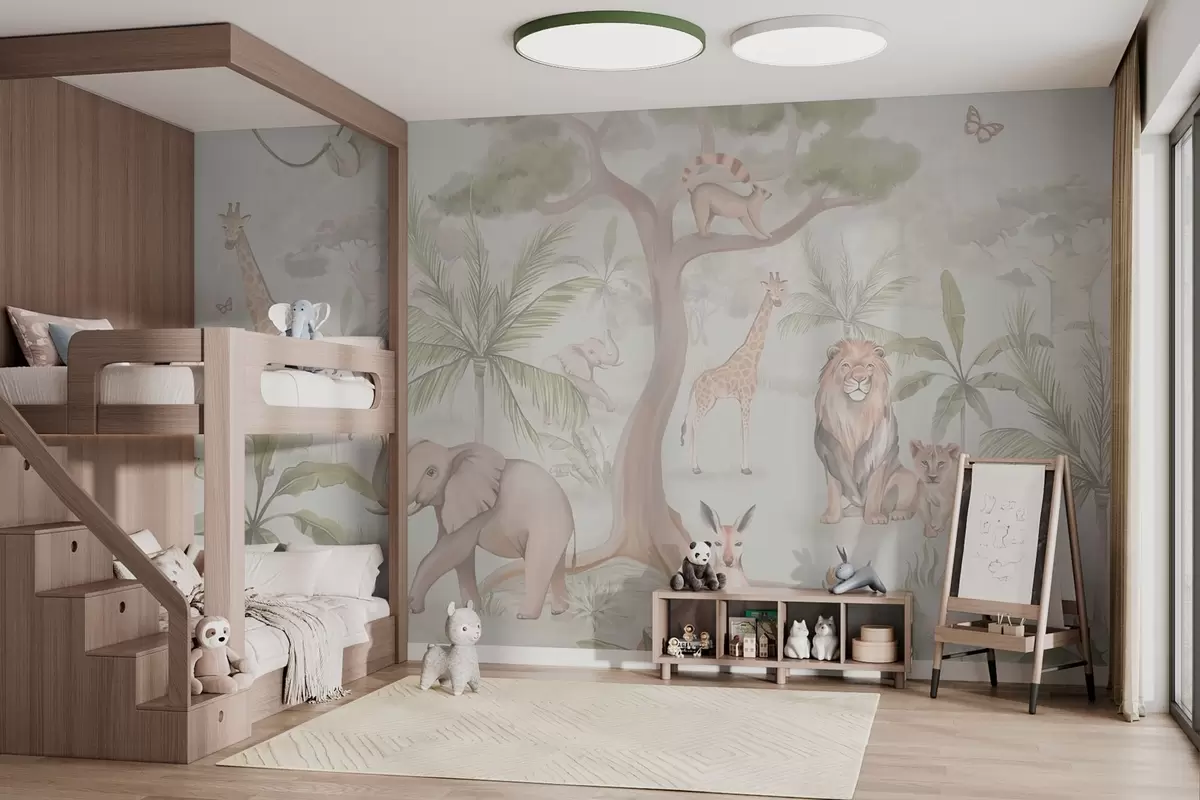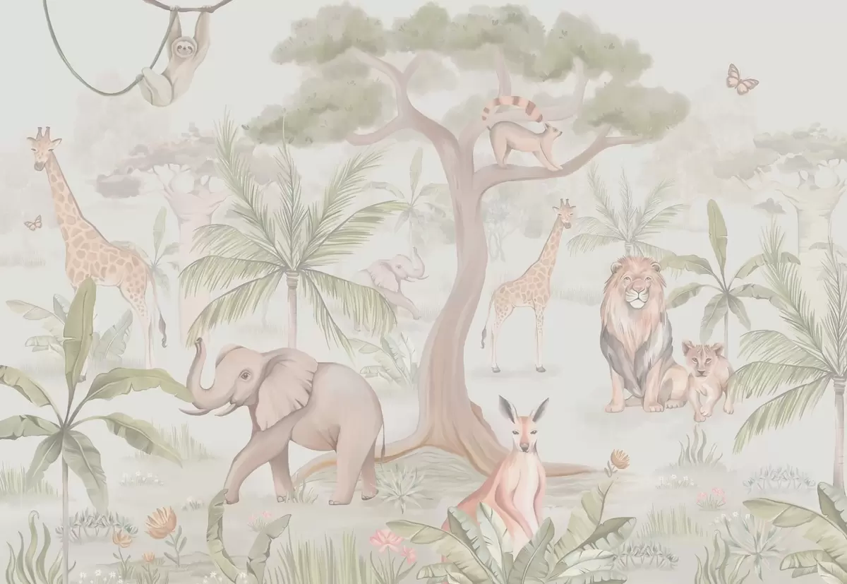 Valokuvatapetti Panoraama viidakon eläimiä vaaleissa väreissä Nr w03444v1