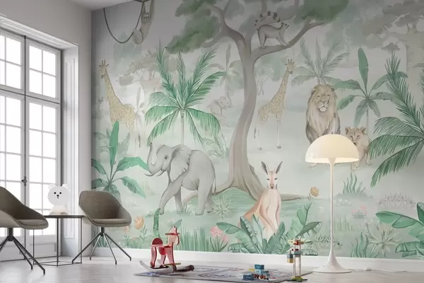Valokuvatapetti Panoraama viidakosta, jossa eläimiä vihreillä sävyillä Nr w03444v2
