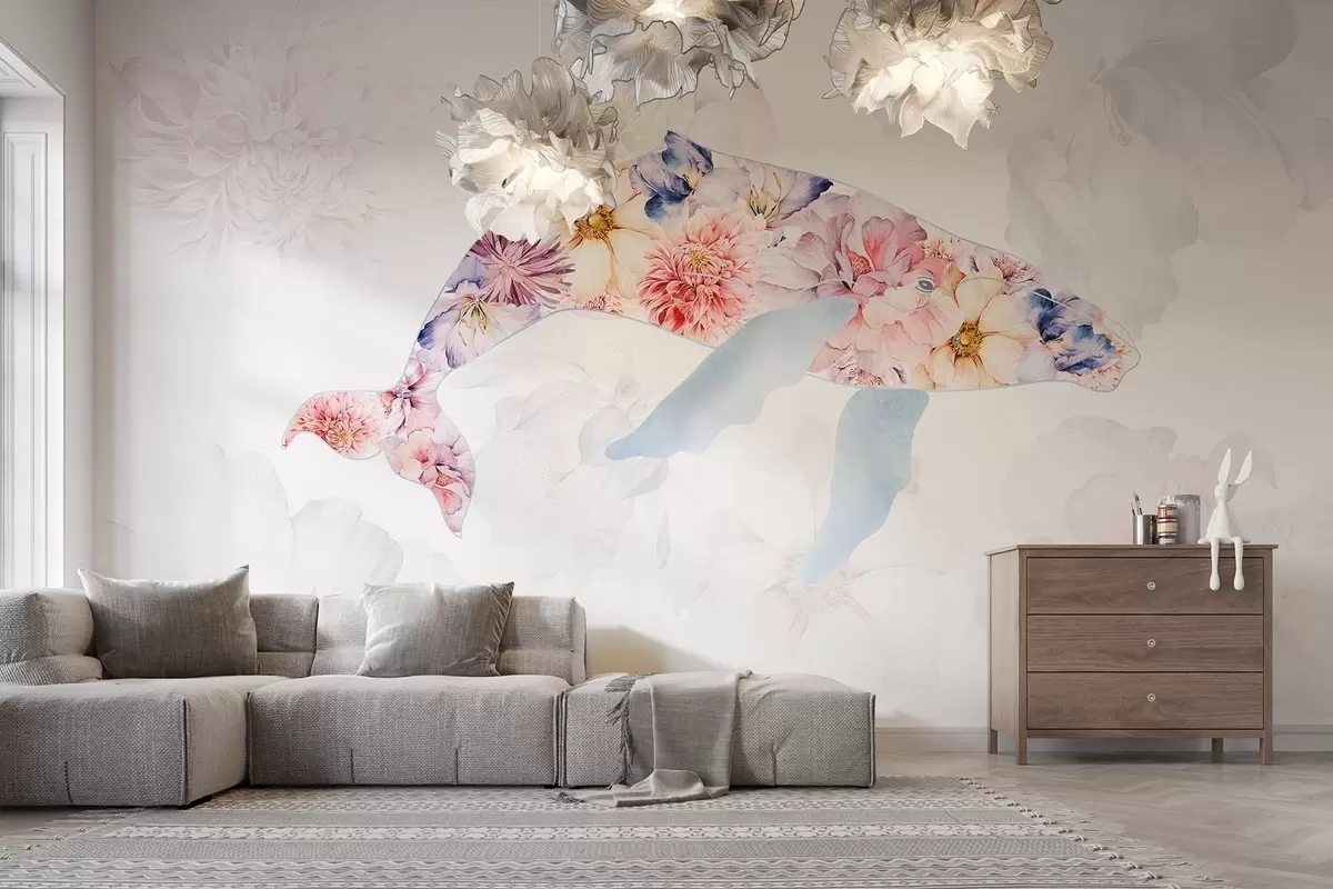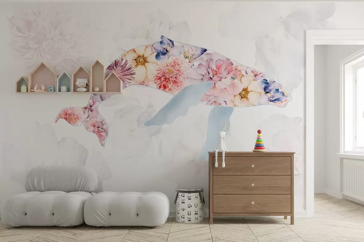Valokuvatapetti Valas vesivärikukkien kanssa, valtameren eläimet, minimalismi, värikäs Nr w03446