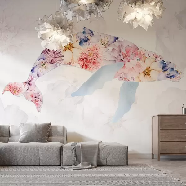 Valokuvatapetti Valas vesivärikukkien kanssa, valtameren eläimet, minimalismi, värikäs Nr w03446