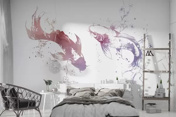 Valokuvatapetti Akvarelli kala, itämainen tyyli, kirsikkapuu, violetit värit Nr w03447v1