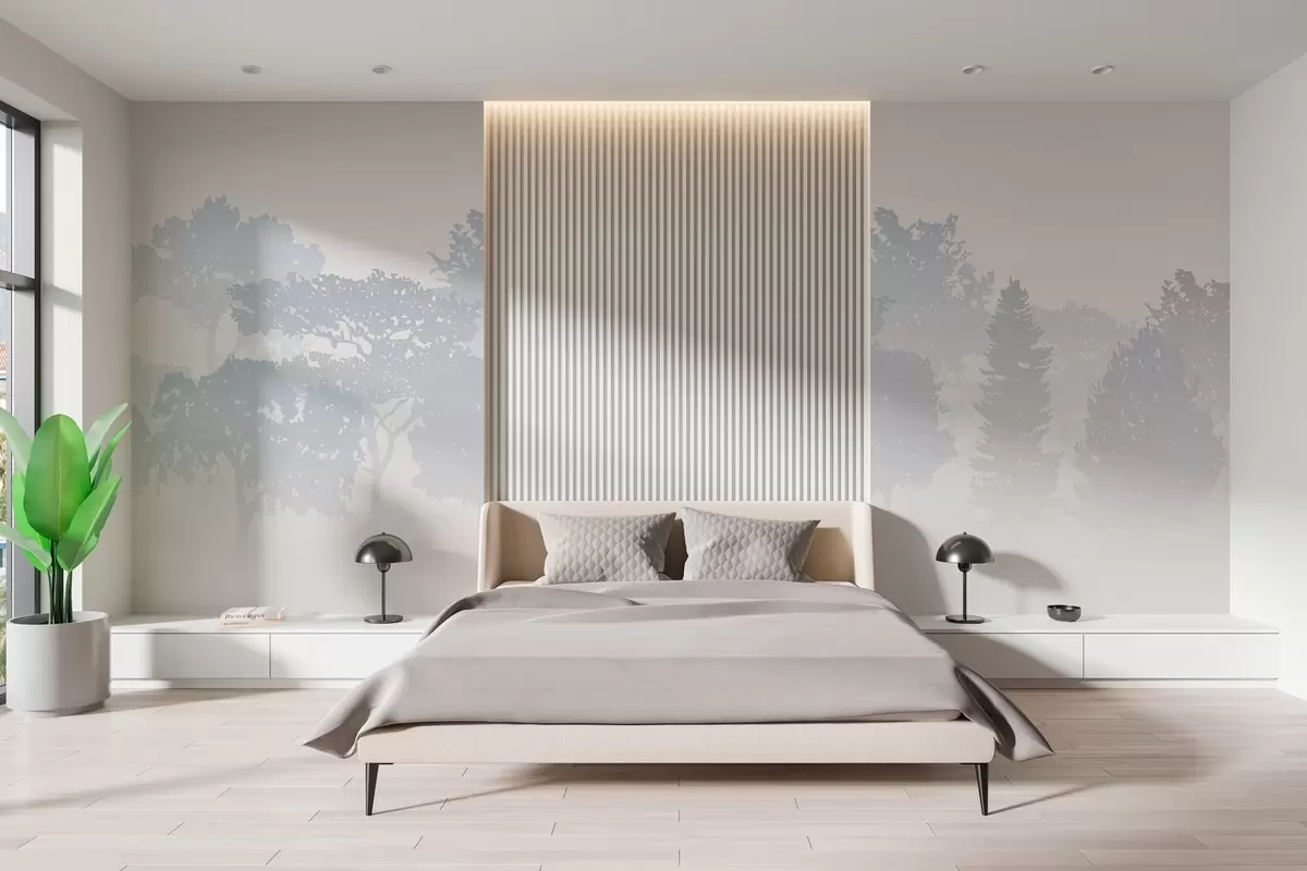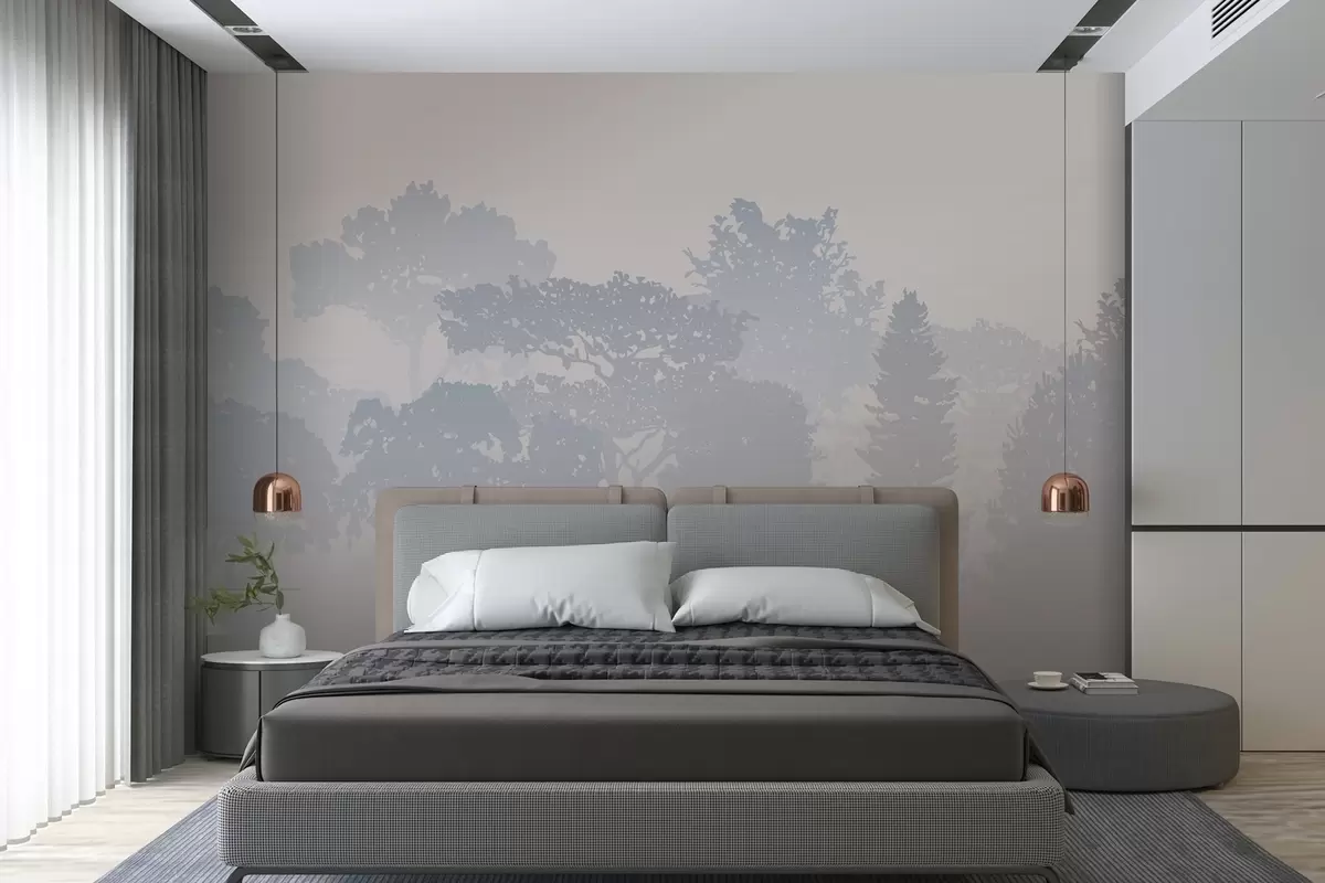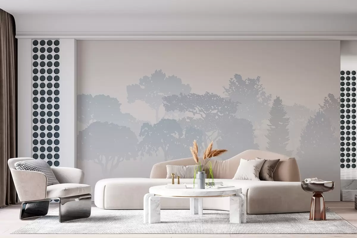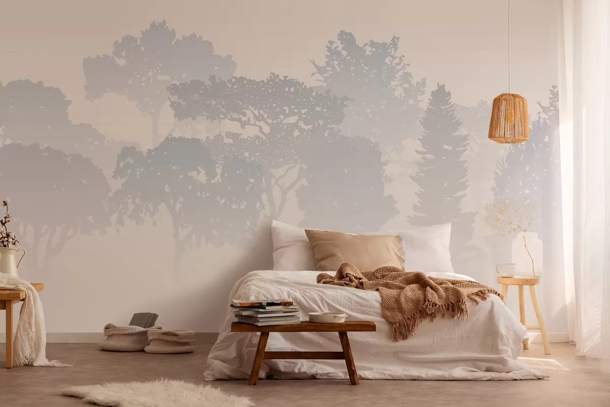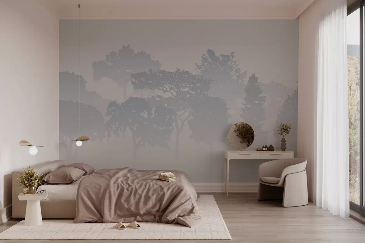 Valokuvatapetti puiden siluetteja sumun huurussa Nr w03451
