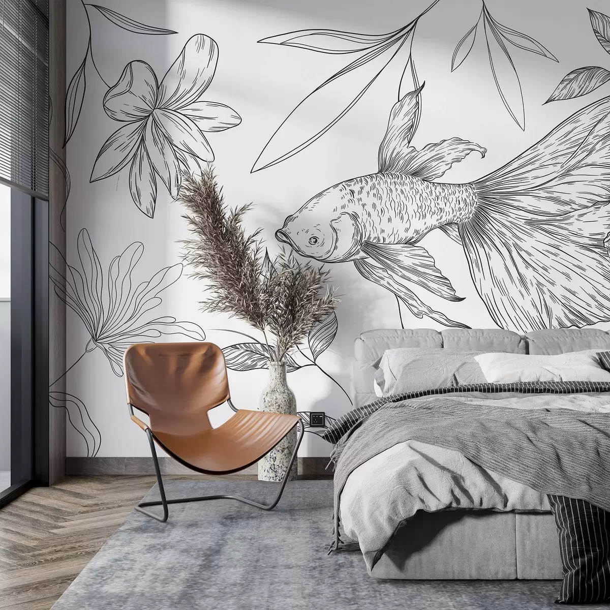 Valokuvatapetti Viivapiirros kala kukkia, minimalismi, meren, kukka, muste tyyliä Nr w03516