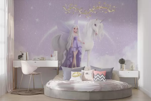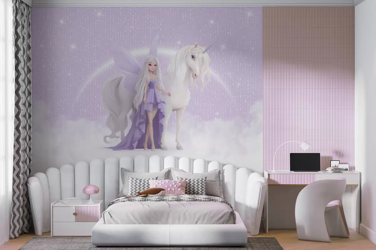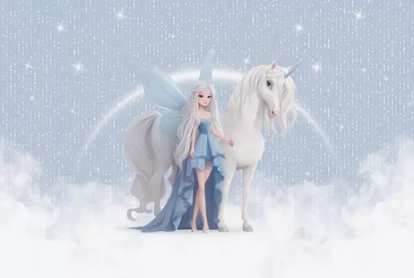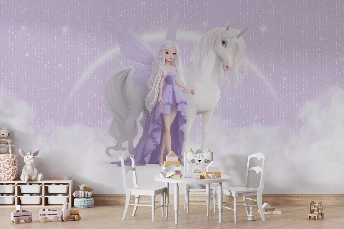Valokuvatapetti Keiju ja yksisarvinen pilvien keskellä - Nr w03527