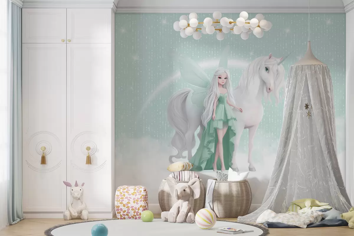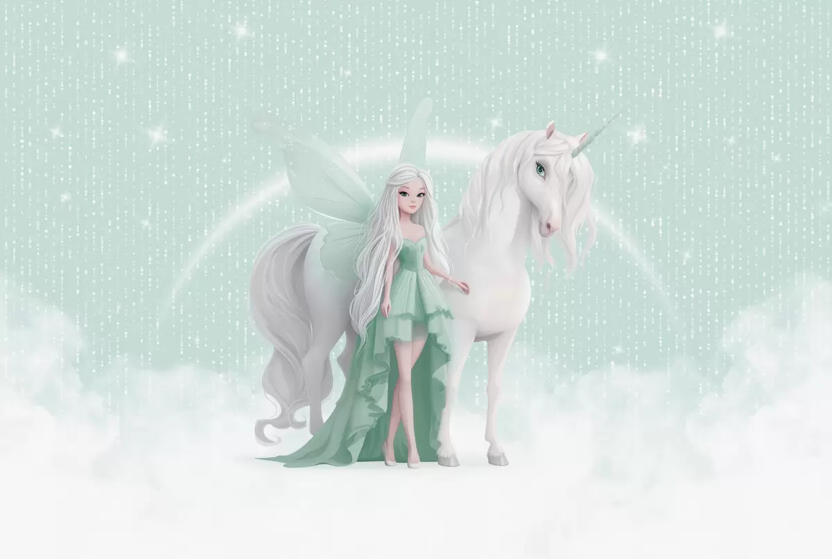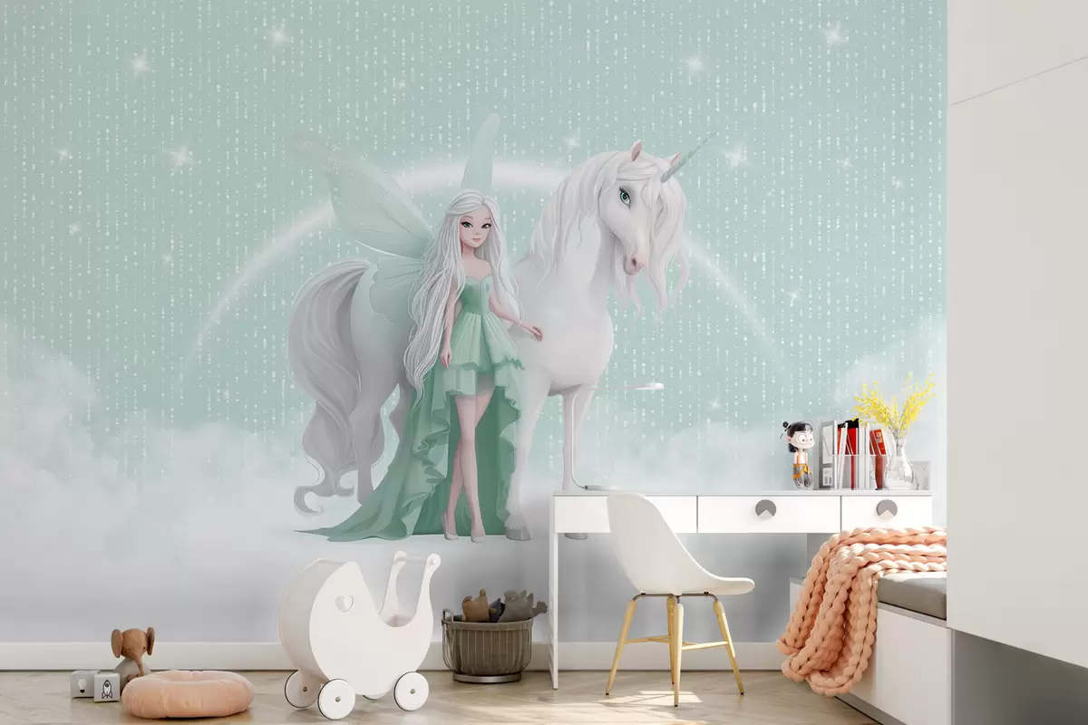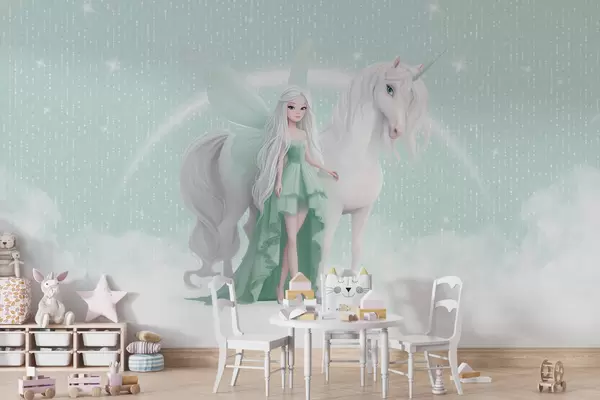 Valokuvatapetti Keiju ja yksisarvinen pilvien keskellä - Nr w03527v2