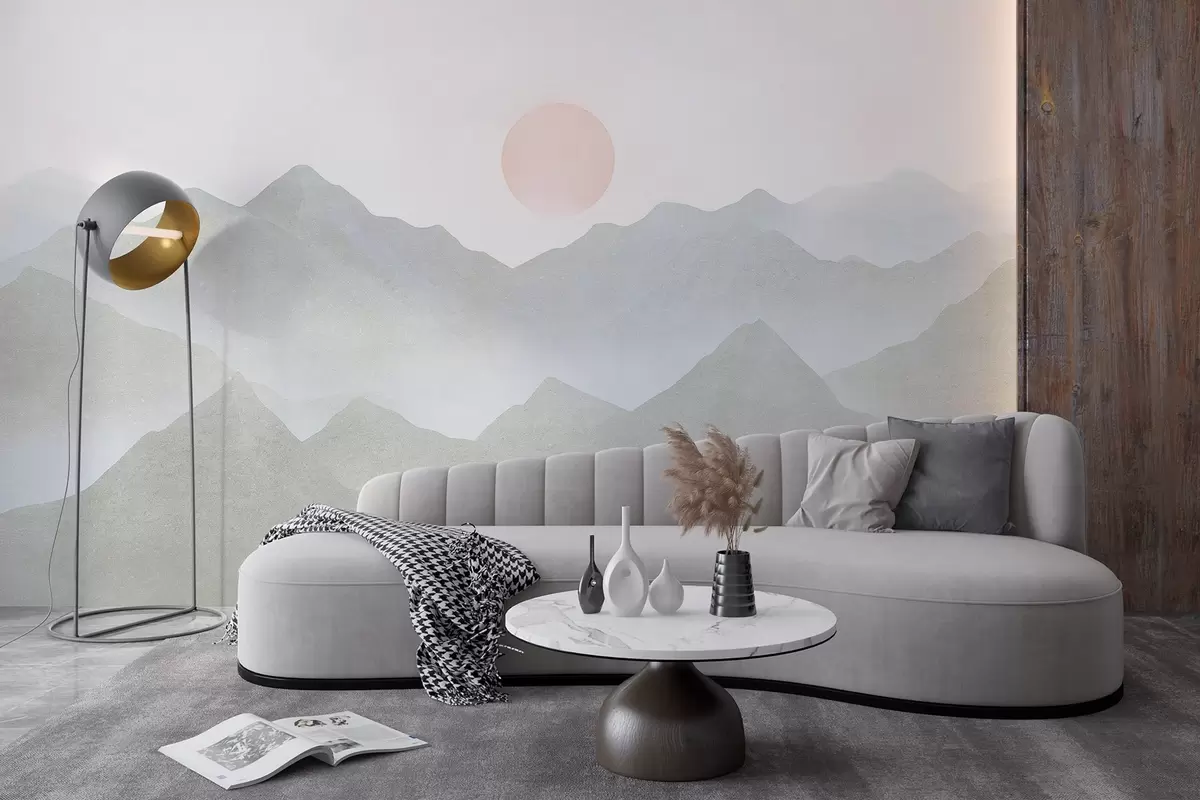 Valokuvatapetti Boho tyyli vuoret maisema, auringonlasku, pehmeä pastelli, harmaa Nr w03547v1