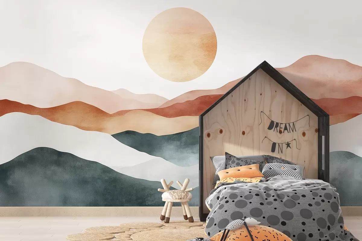 Valokuvatapetti Akvarelli vuoret auringon kanssa, boho tyyli, punainen, oranssi, harmaa Nr w03551