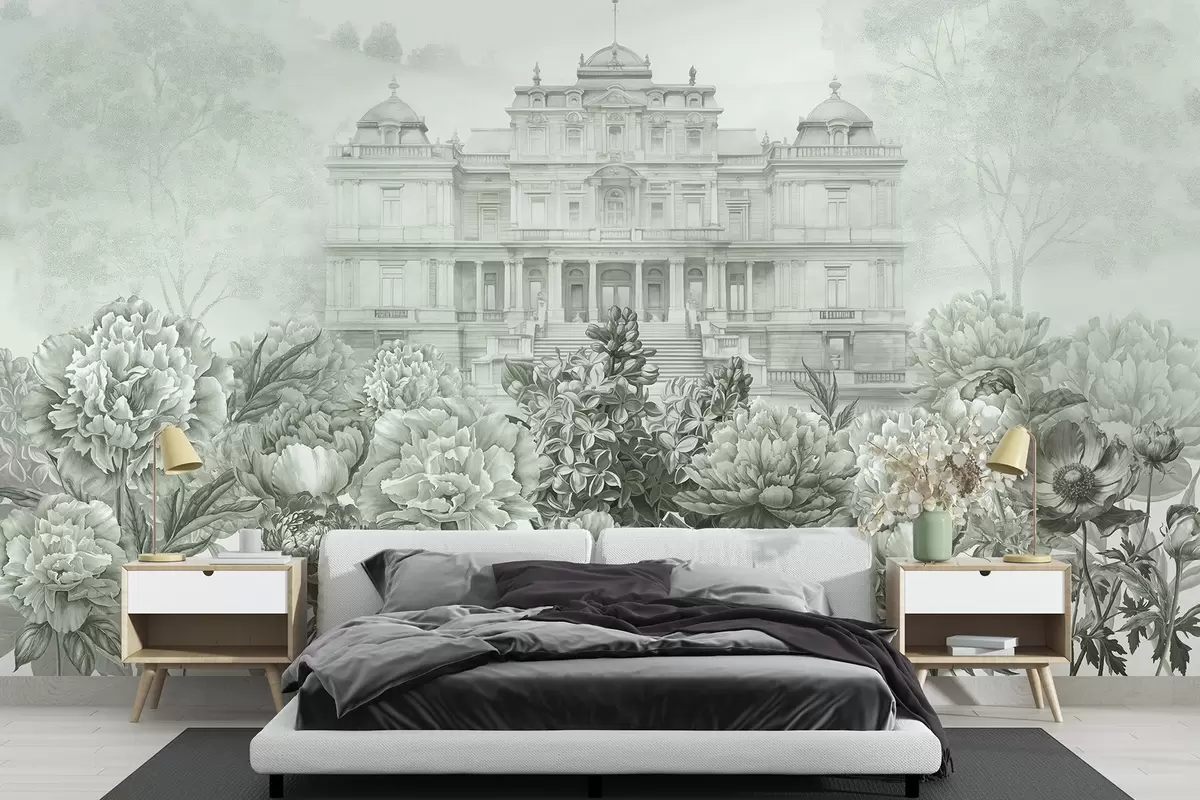 Valokuvatapetti Kuninkaallinen palatsi ja pioni puutarha, akvarelli tyyli, luonto, vihreät värit, boho Nr w03552v2