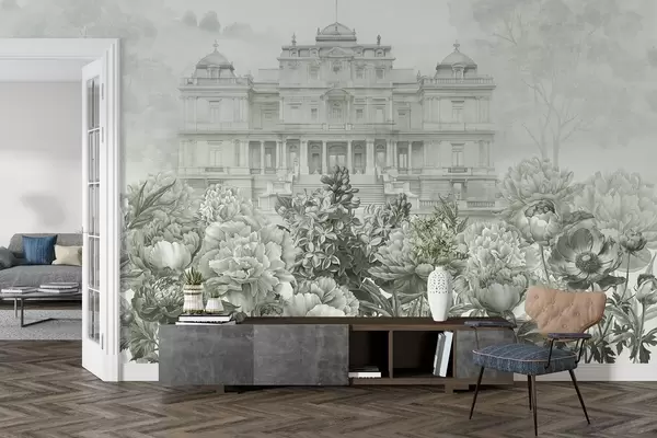 Valokuvatapetti Kuninkaallinen palatsi ja pioni puutarha, akvarelli tyyli, luonto, vihreät värit, boho Nr w03552v2