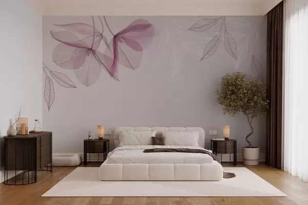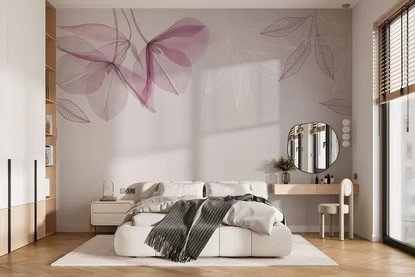 Valokuvatapetti hennot läpikuultavat kukat ja lehdet violetin sävyisinä Nr w03616v4