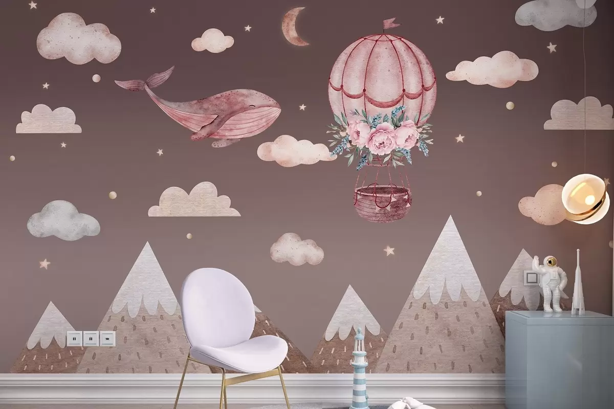 Valokuvatapetti Söpö valas ja ilmapallo, tumma taivas pilviä, vuoret, akvarelli, vaaleanpunaiset värit Nr w03673v1