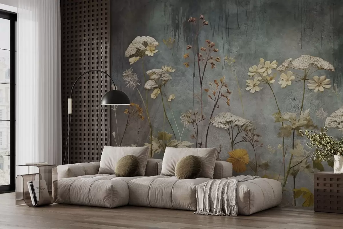 Valokuvatapetti Luonnonvaraisia kukkia ja ruohoja grunge seinän taustalla Nr w03697