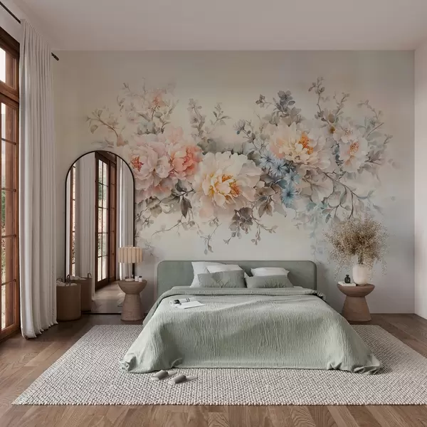 Valokuvatapetti herkkiä akvarellityylisiä kukkia vaaleanpunaisen, beigen ja sinisen pastellisävyissä sävyissä Nr w03724