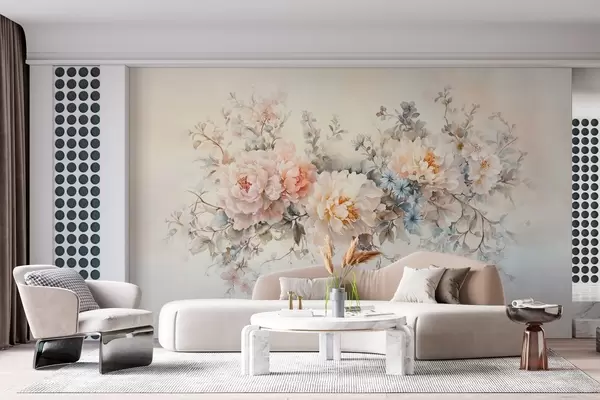 Valokuvatapetti herkkiä akvarellityylisiä kukkia vaaleanpunaisen, beigen ja sinisen pastellisävyissä sävyissä Nr w03724