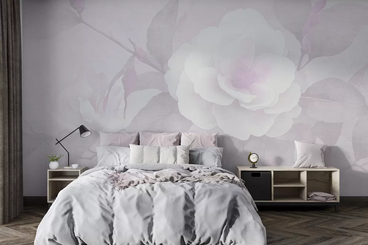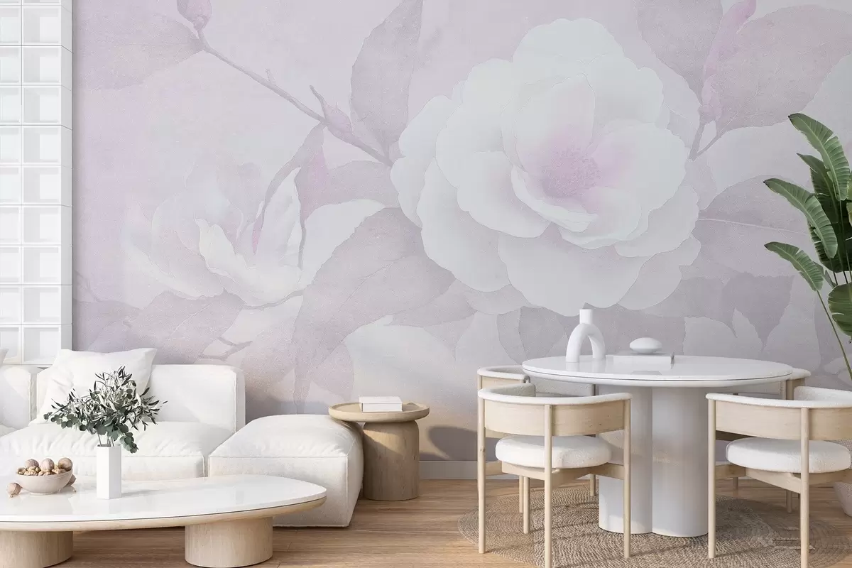 Valokuvatapetti Pehmeä pastelli, jossa on kameliakukkia oksalla, vaaleanpunaiset värit Nr w03760v2