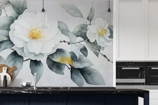 Valokuvatapetti Vesivärityyliin kamelia kukkia oksalla, luonnon värit Nr w03761