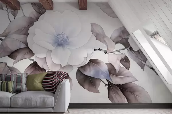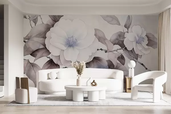Valokuvatapetti Vesivärityyliin kamelia kukkia oksalla, violetit värit Nr w03761v1
