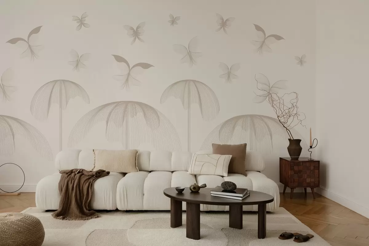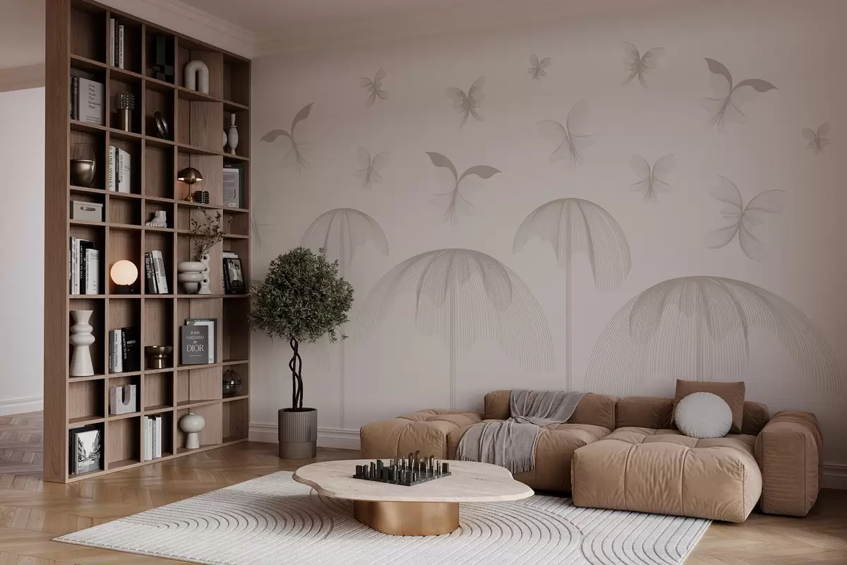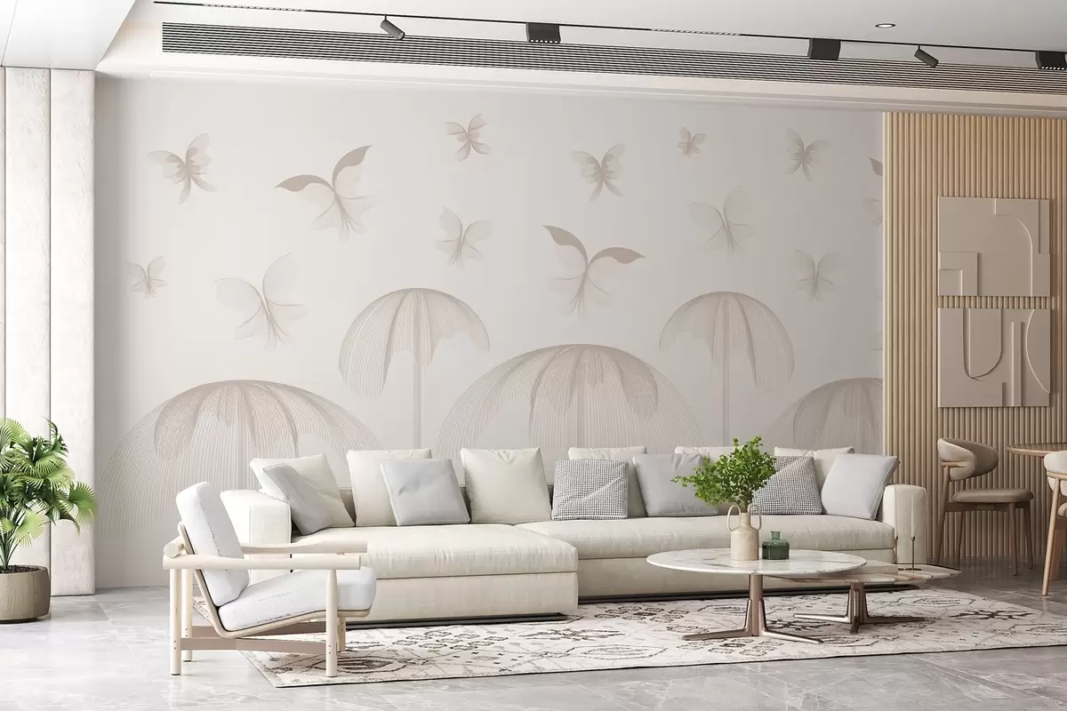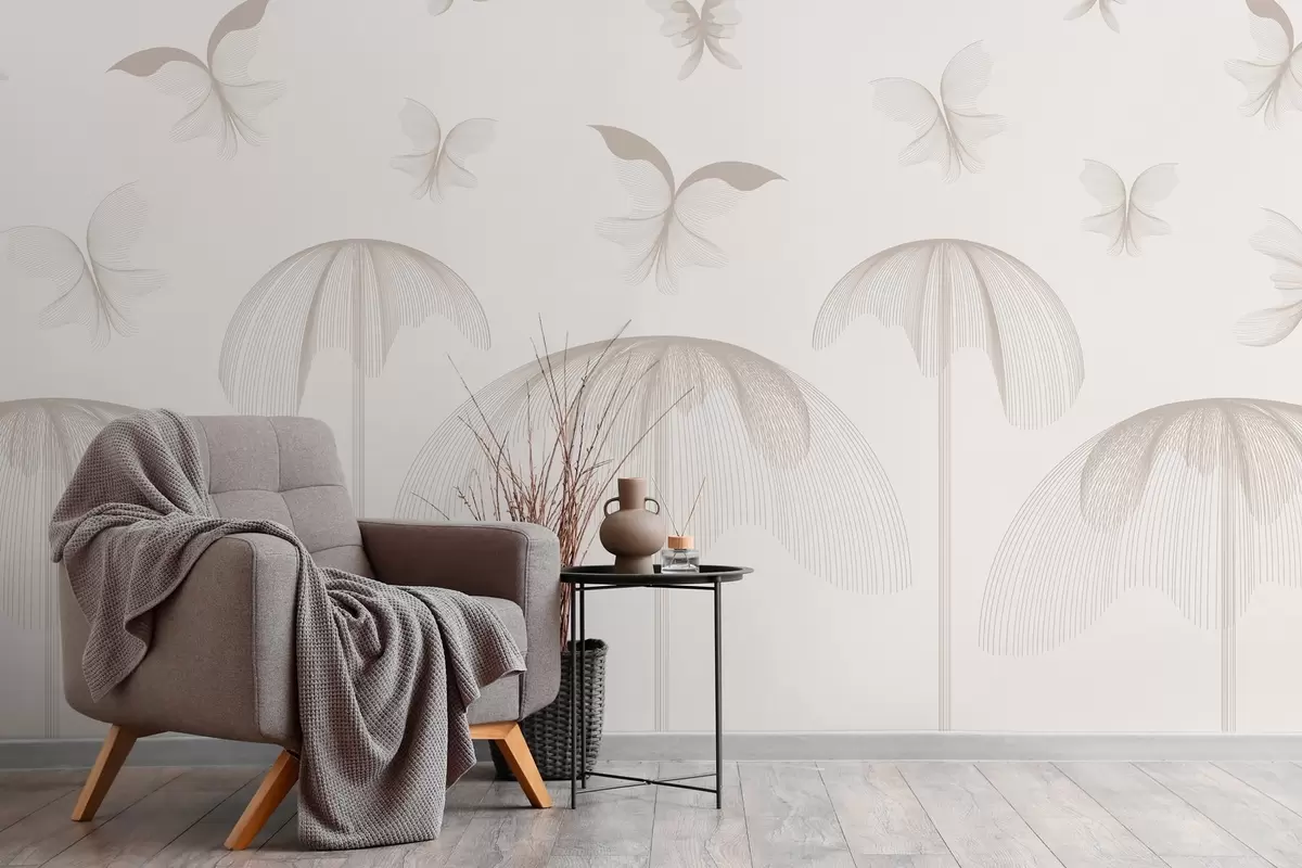 Valokuvatapetti minimalistinen lineaarinen taustakuva perhosia ja suihkulähteitä maitomaisella taustalla Nr w03762