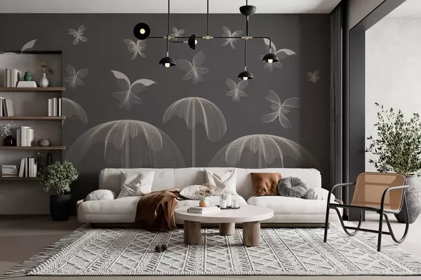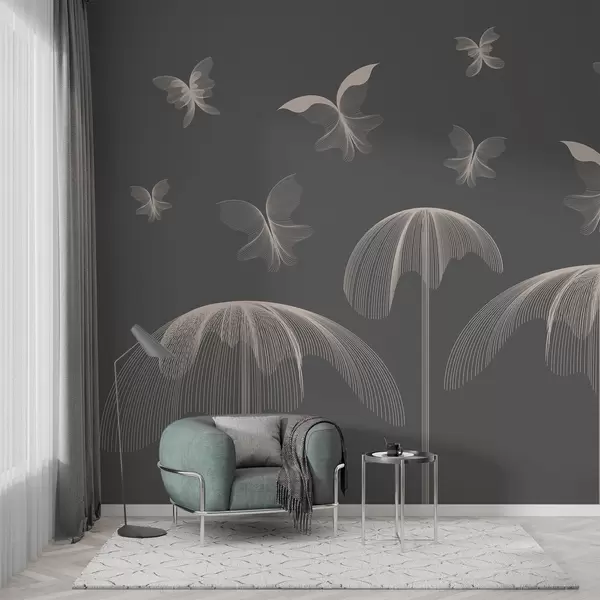 Valokuvatapetti minimalistinen lineaarinen taustakuva perhosia ja suihkulähteitä tummanharmaalla taustalla Nr w03762v1