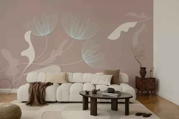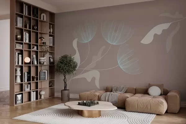 Valokuvatapetti tyylikkäät minimalistiset kukat valkoisen ja sinisen sävyillä mokkan värisellä pohjalla Nr w03763v3