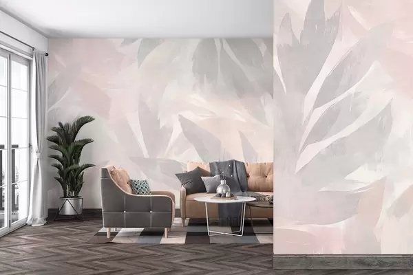 Valokuvatapetti Trooppiset lehdet, kukka, palmupuut, pastelli tyyli, vaaleanpunaiset ja beiget värit Nr w03881