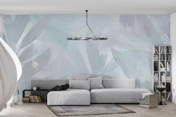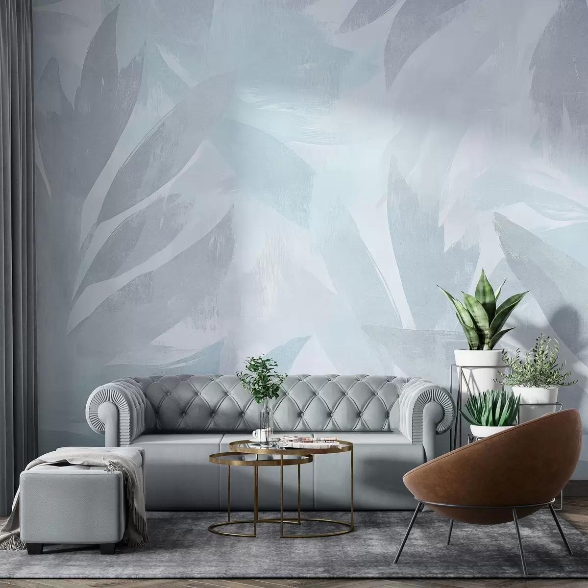 Valokuvatapetti Trooppiset lehdet, kukka, palmupuut, pastelli tyyli, siniset värit Nr w03881v2