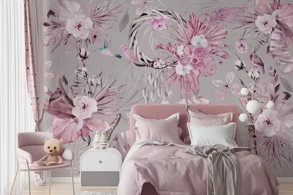Valokuvatapetti Boho-tyylinen koriste, jossa pionikukkia ja lintuja, vesivärityyli, vaaleanpunaiset värit Nr w03885v1