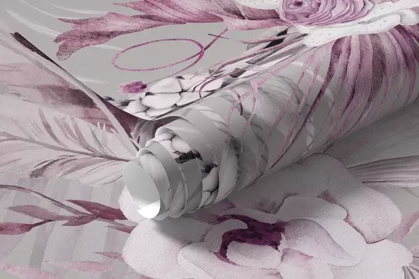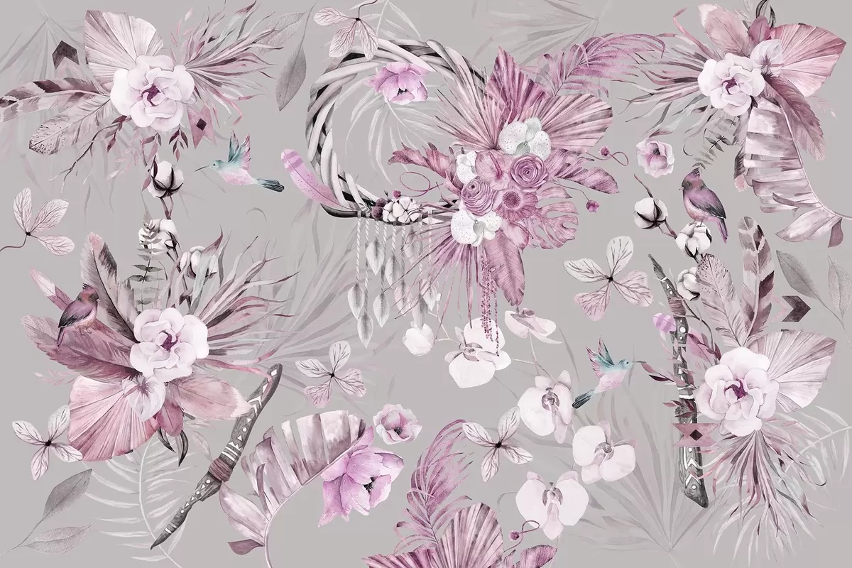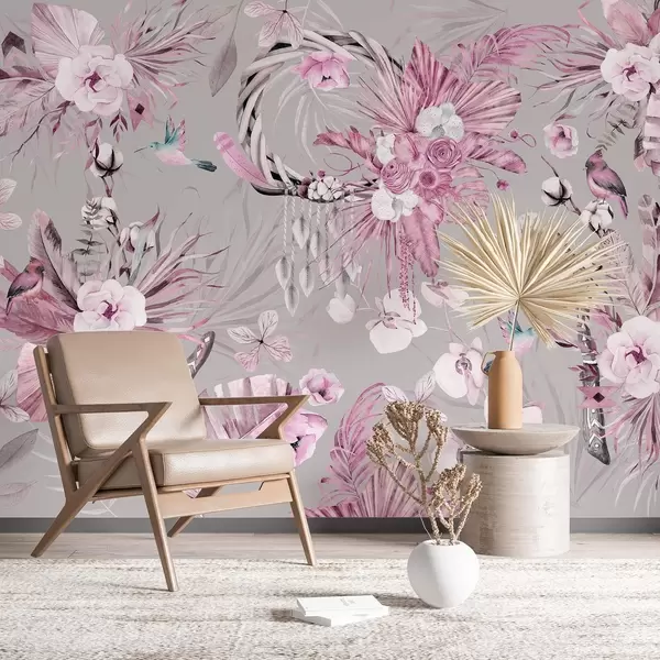 Valokuvatapetti Boho-tyylinen koriste, jossa pionikukkia ja lintuja, vesivärityyli, vaaleanpunaiset värit Nr w03885v1