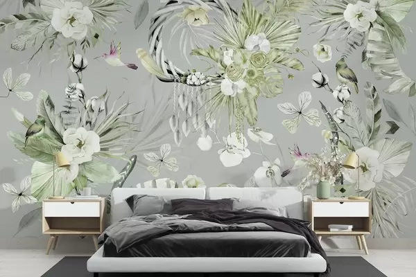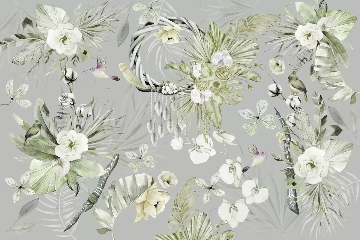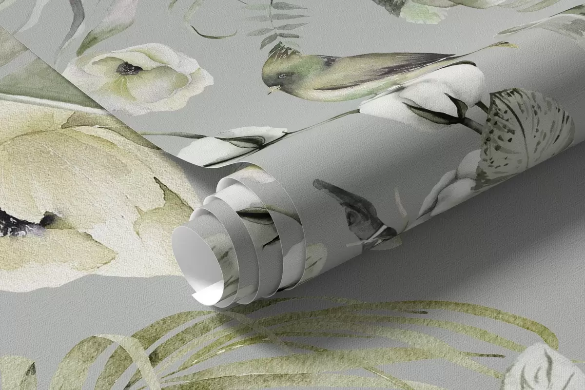 Valokuvatapetti Boho-tyylinen koriste, jossa pionikukkia ja lintuja, vesivärityyli, vihreät värit Nr w03885v2