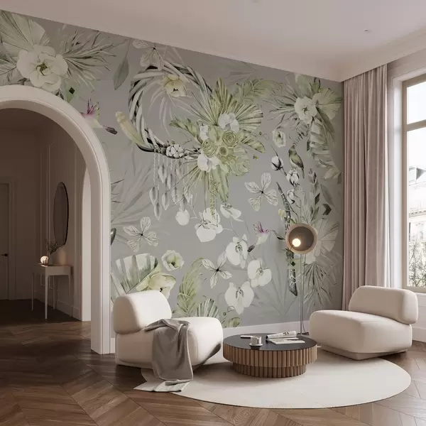 Valokuvatapetti Boho-tyylinen koriste, jossa pionikukkia ja lintuja, vesivärityyli, vihreät värit Nr w03885v2