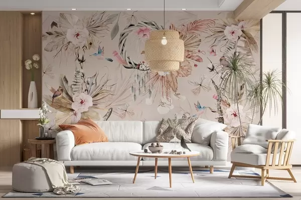 Valokuvatapetti Boho-tyylinen koriste, jossa pionikukkia ja lintuja, vesivärityyli, pehmeät värit w03885v3